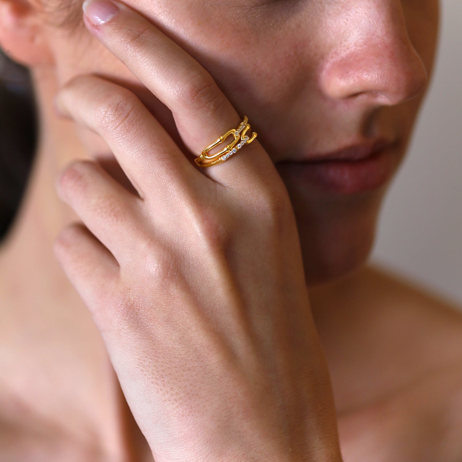 El anillo Arcana encarna el misterio y la sofisticación moderna. Su diseño doble, con eslabones dorados y circonitas, crea un juego de luz que envuelve los dedos con elegancia y equilibrio. Este anillo representa la unión entre lo visible y lo oculto, entre el brillo y la forma. Perfecto para quienes buscan una joya versátil y contemporánea.