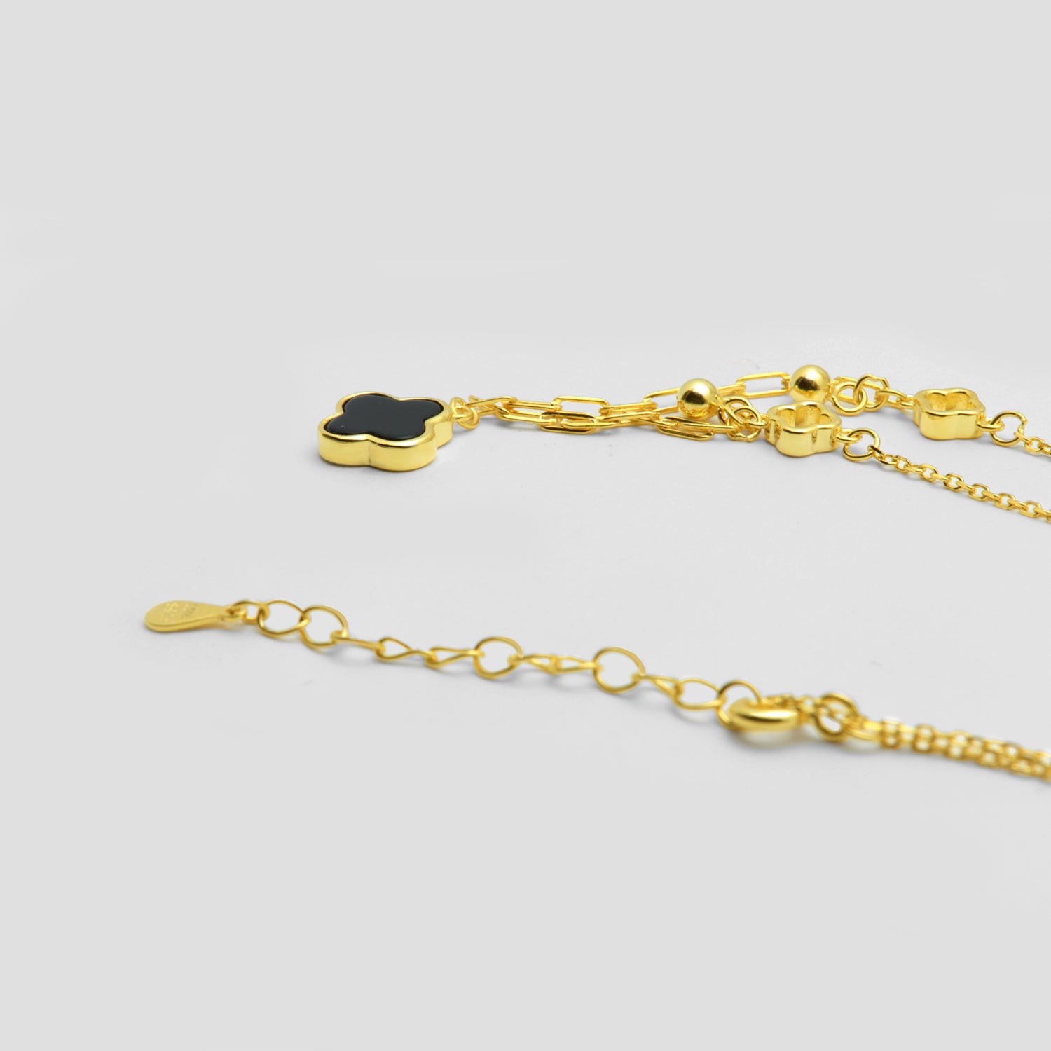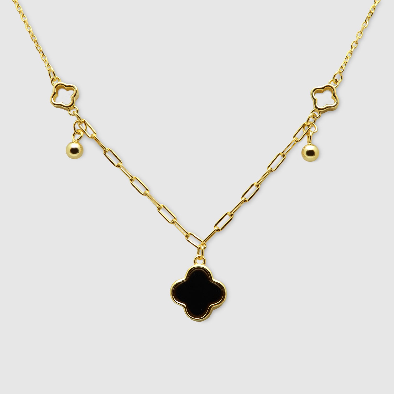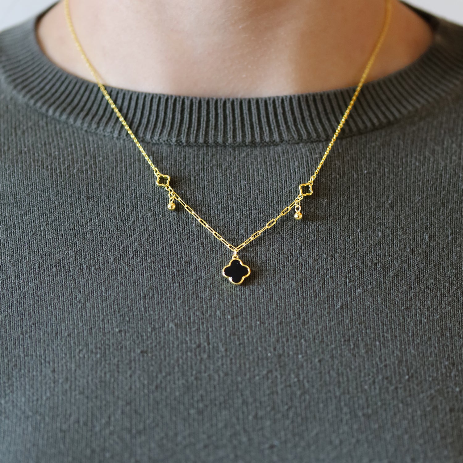 Gargantilla Plata 925 con motivo central de trébol y dos motivos intercalados en la cadena. Su diseño combina el resplandor del oro con el misterio del negro, creando un contraste que cautiva con sutileza y carácter. Ilumina lo cotidiano y eleva cualquier look.