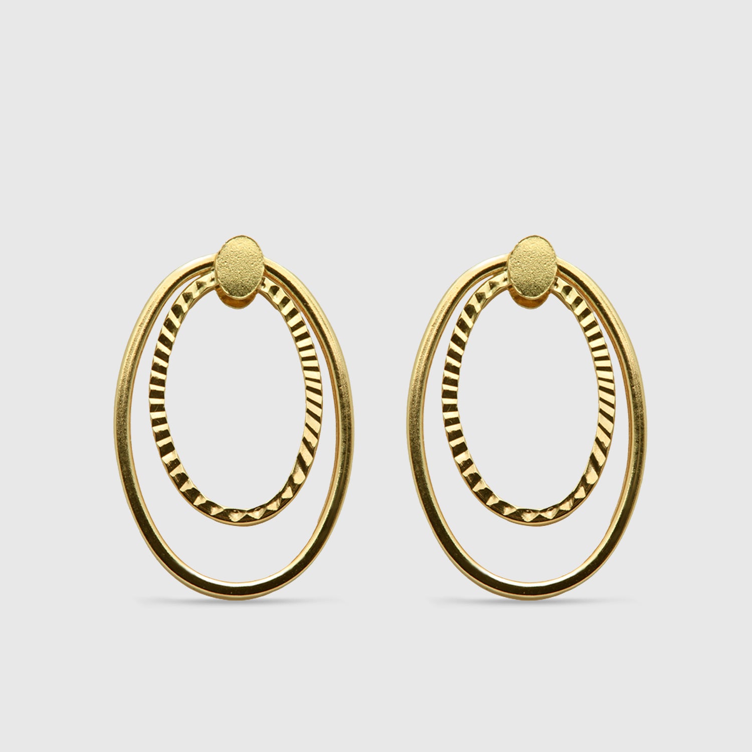 Pendientes Oro 18K con forma doble ovalada. Fusionan líneas geométricas y texturas que juegan con la luz para crear un movimiento hipnótico y equilibrado. Son una pieza audaz y atemporal que eleva cualquier estilo con un toque de brillo sutil y carácter.
